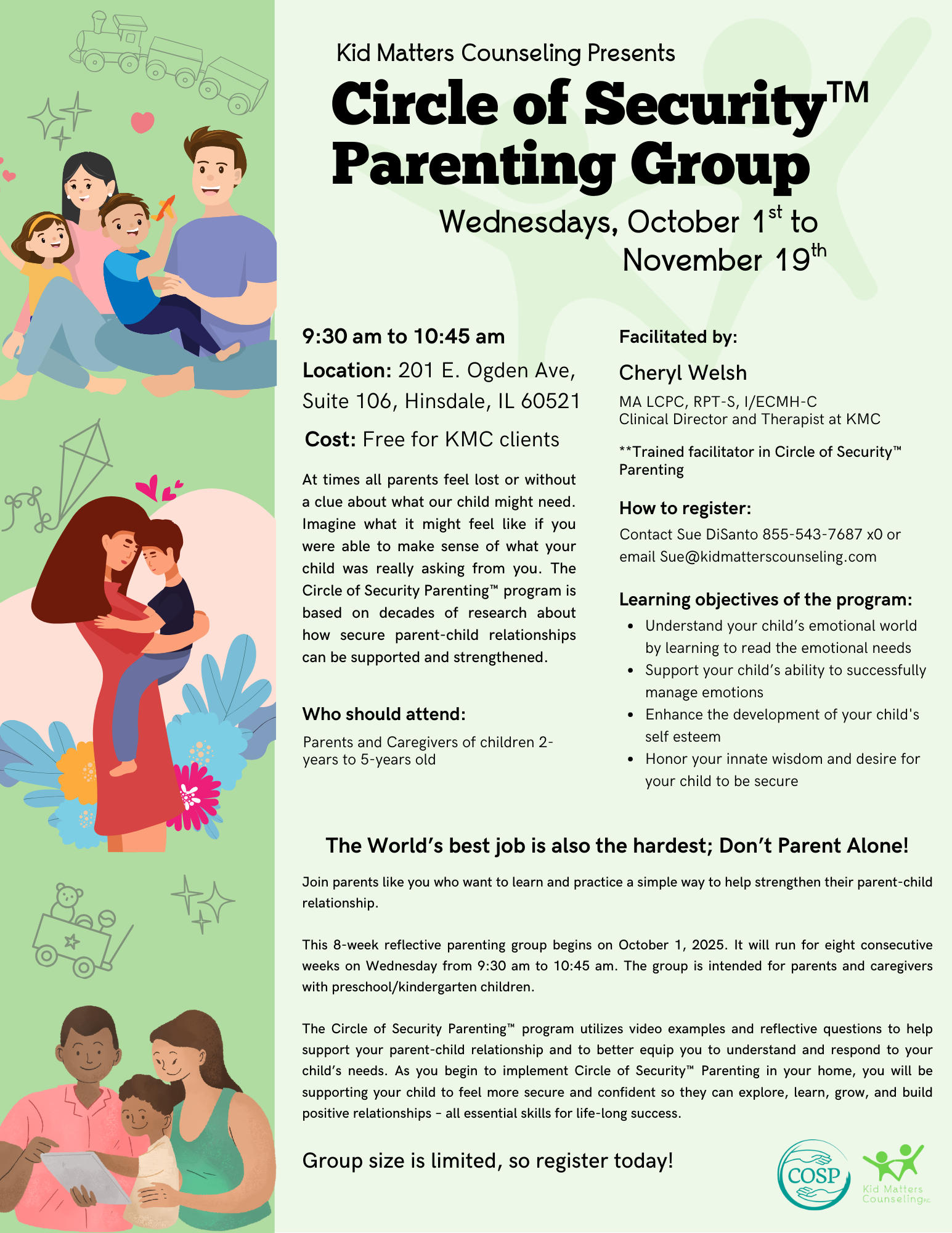 Contact Sue DiSanto 855-543-7687 x0 or email Sue@kidmatterscounseling.com